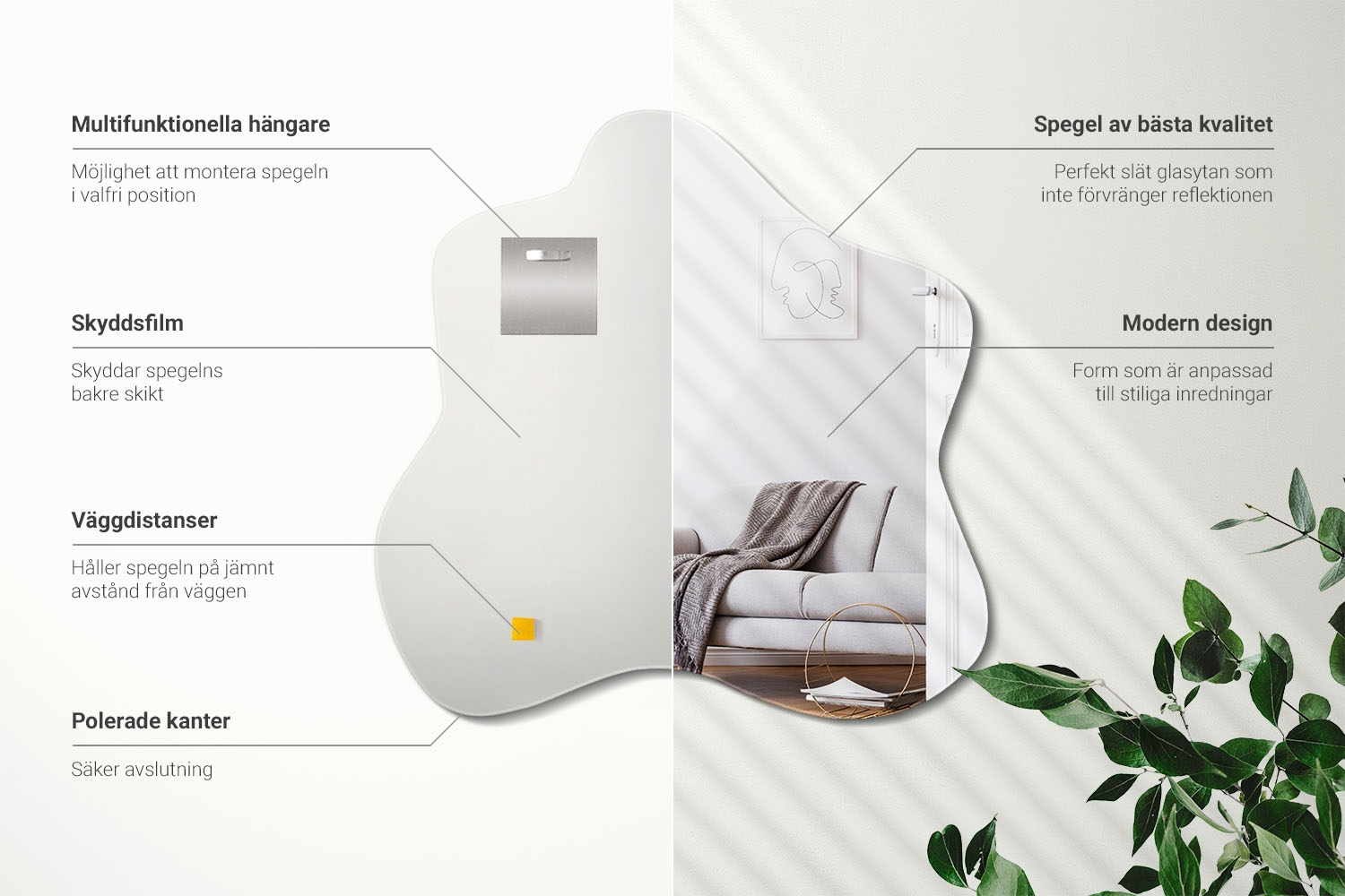 En spegel i form av en fläck är mer än bara en praktisk detalj – det är ett designelement som sätter personlig prägel på ditt hem. Tack vare de olika måtten kan du välja storleken som passar bäst för ditt utrymme, oavsett om du vill skapa en iögonfallande fokuspunkt eller ett subtilt inslag. Denna spegel kombinerar estetik och funktion på ett sätt som gör ditt rum både ljusare och visuellt större, samtidigt som den adderar en känsla av elegans och modernitet.